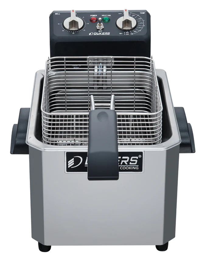 The Dukers DCF15E One Basket Electric Countertop Fryer is a compact yet powerful appliance designed for commercial kitchens. With a capacity of 15lbs, it offers efficient frying for various foods. Its stainless steel furnace body ensures durability and efficient heat distribution, promoting energy savings with its fast heating speed and uniform temperature. The fryer features a novel design with convenient operation and humanized cooking experience. Equipped with a power button switch to prolong the thermostat's life, constant temperature heating, warm timing tips, and over-temperature protection, it ensures safe and easy operation. The thickened stainless steel oil basin enhances structural strength and durability, while automatic heating cessation upon reaching the set temperature and restart below ensures precise temperature control. Compact with dimensions of 14" x 19" x 12", it's suitable for countertop placement, ideal for smaller kitchen spaces.