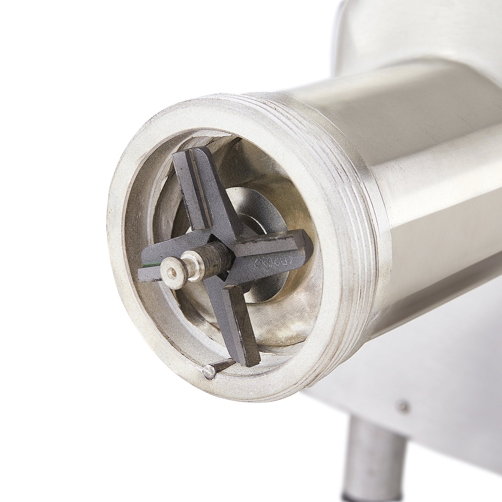 This powerful, heavy duty meat grinder is ideal for breaking down all types of boneless meat. Commonly used in butcher shops and other high volume operations. Constructed with a stainless steel body, this unit is designed to save time and money by simplifying the meat grinding process. Using its powerful 3 horsepower and 220 volt motor, the KG-32-MP grinds meat at a 55lb per minute rate. Its robust gear transmission allows users to easily process meat with no belts or pulleys to maintain. This grinder comes complete with a knife, plate and meat pusher.