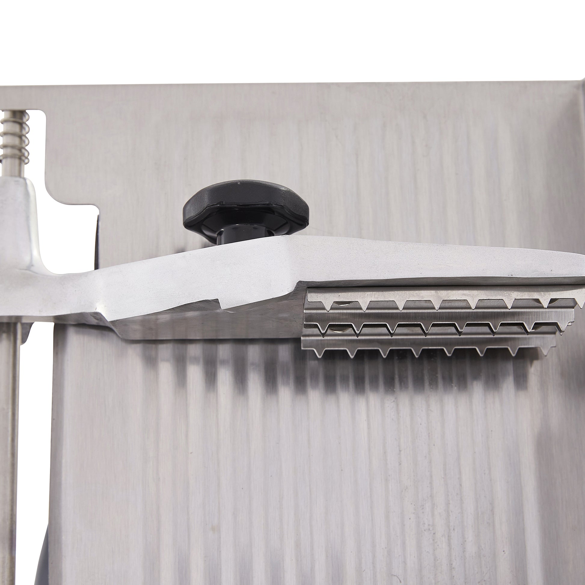 This heavy duty, gear-driven, manual slicer is a robust and efficient solution for businesses with high volume slicing needs. The KMS-13 features a non-corrosive, 13” German stainless steel blade, which can be easily sharpened with the built-in sharpener. Its robust gear-driven transmission has a powerful torque that allows for easy slicing of a wide variety of semi-frozen, boneless meat, cold cuts and cheeses. The KMS-13 is designed for ease of operation and long lasting use.