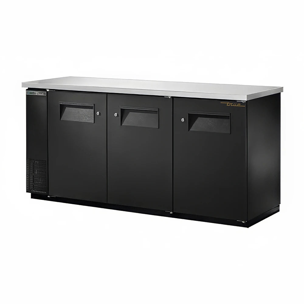 True TBB-24-72-HC Three Section Back Bar Cooler is designed with enduring quality and value to assure colder product temperatures and years of trouble free service. True extra-large evaporator coil is balanced with a higher horsepower compressor and large condenser to maintain cabinet temperatures of 33°F to 38°F (.5°C to 3.3°C). The exterior of this (3) section solid door refrigerated back bar cooler is made of heavy duty, wear resistant black vinyl on the sides and front with a stainless steel top. The back of the unit is a matching black made of aluminum. The entire cabinet structure and (3) solid locking doors are foamed-in-place using Ecomate. Ecomate is a high density polyurethane insulation that has zero ozone depletion potential (ODP) and zero global warming potential (GWP). The florescent lit interior has a stainless steel floor with a ½ inch lip and heavy gauge galvanized steel walls. The door threshold protector prevents damage to the cabinet from routine loading of product. The (3) positive seal doors are fitted with 12 inch long recessed handles and removable one piece magnetic gaskets for easy cleaning. The TBB-24-72 has (4) heavy duty PVC coated shelves that are adjustable at ½ inch increments. The unit can accommodate (3) ½ barrels or (84) 6-packs of 12 ounce cans. 1/3 HP, 115v/60/1, 5.2 amps, 7 foot cord, NSF, NEMA 5-15P, MADE IN USA.