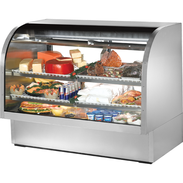 True’s curved glass deli case combines efficient, high volume merchandising and exceptional refrigeration with an elegant curved glass front for sophisticated presentation of deli products. High humidity gravity coil refrigeration system maintains 38°F to 40°F (3.3°C to 4.4°C) for the freshest display of meats, cheeses and deli products. Factory engineered, self-contained, capillary tube system using environmentally friendly R290 hydrocarbon refrigerant that has zero (0) ozone depletion potential (ODP), & three (3) global warming potential (GWP). Cabinet is NSF/ANSI Standard 7 certified to hold open food product. Insulated double pane curved front glass provides maximum insulation value for greater efficiency and energy savings. Both panes are tempered for safety. Four (4) adjustable, lighted, cantilevered PVC coated shelves. LED lights are low UV emitting to enhance product appearance and increase shelf life. All stainless steel interior and exterior.