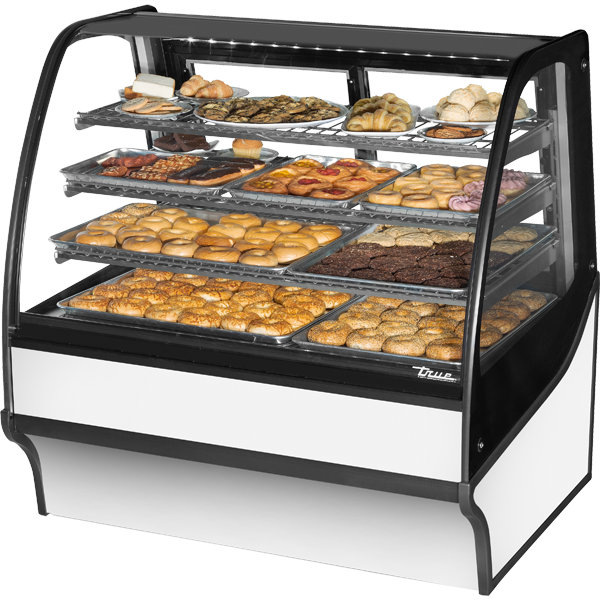 True’s "dry" display case combines efficient, high volume merchandising with an elegant curved glass front for sophisticated presentation of high end desserts and pastries. Cabinet is NSF/ANSI Standard 2 certified to hold open food product. Two (2) rear sliding glass doors for back access. Exterior – stainless steel rounded front and back, stainless steel side and front panels. Curved glass front and side glass panels. Interior – powder coated FDA white over CRS material. Color options available (upcharge applies) – black or stainless. Three (3) tiered levels of adjustable wire cantilever shelves that match cabinet interior color. Chrome plated wire shelves standard on stainless units. Front glass swings Up for easy cleaning access.