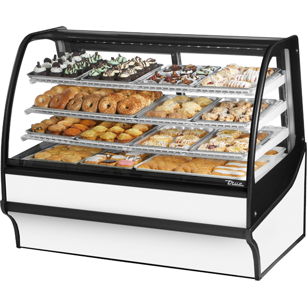 True’s "dry" display case combines efficient, high volume merchandising with an elegant curved glass front for sophisticated presentation of high end desserts and pastries. Cabinet is NSF/ANSI Standard 2 certified to hold open food product. Two (2) rear sliding glass doors for back access. Exterior – powder coated FDA white rounded front and back, white aluminum aesthetic side and front panels. Color options available (upcharge may apply) – black or stainless. Curved glass front and side glass panels. Interior – powder coated FDA white over CRS material. Color options available (upcharge applies) – black or stainless. Three (3) tiered levels of adjustable wire cantilever shelves that match cabinet interior color. Chrome plated wire shelves standard on stainless units. Front glass swings Up for easy cleaning access.