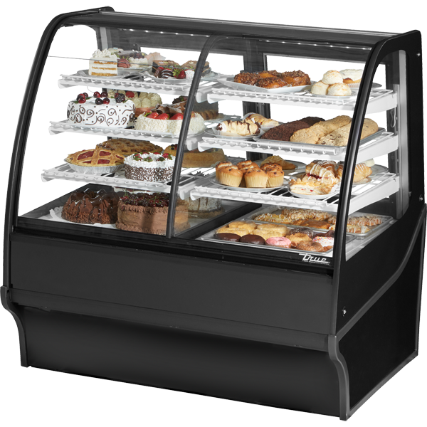 True’s refrigerated display merchandisers combine efficient, high volume merchandising and exceptional refrigeration with an elegant curved glass front for sophisticated presentation of high end desserts and pastries. Refrigerated section features factory engineered, self-contained, capillary tube system using environmentally friendly R290 hydro carbon refrigerant that has zero (0) ozone depletion potential (ODP), & three (3) global warming potential (GWP). Refrigerated section features high capacity, factory balanced refrigeration system. Standard temperature range maintains cabinet temperatures of 33°F to 41°F (.5°C to 5°C), ideally suited for refrigerated bakery and cold deli products. Cabinet is NSF/ANSI Standard 7 compliant to hold open food product. Two (2) rear sliding glass doors for back access. Exterior – powder coated FDA black rounded front and back, black aluminum aesthetic side and front panels. Color options available (upcharge may apply) – white or stainless. Curved glass front and side glass panels. Interior – powder coated FDA white over CRS material. Color options available (upcharge may apply) – black or stainless. Six (6) tiered levels of adjustable wire cantilever shelves that match cabinet interior color. Chrome plated wire shelves standard on stainless units. Front glass swings Up for easy cleaning access.