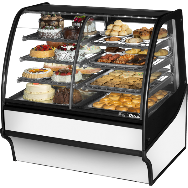True’s refrigerated display merchandisers combine efficient, high volume merchandising and exceptional refrigeration with an elegant curved glass front for sophisticated presentation of high end desserts and pastries. Refrigerated section features factory engineered, self-contained, capillary tube system using environmentally friendly R290 hydro carbon refrigerant that has zero (0) ozone depletion potential (ODP), & three (3) global warming potential (GWP). Refrigerated section features high capacity, factory balanced refrigeration system that has two (2) temperature range options. Standard temperature range maintains cabinet temperatures of 33°F to 41°F (.5°C to 5°C), ideally suited for refrigerated bakery and cold deli products. Optional temperature range maintains cabinet temperatures of 42°F to 65°F (5.5°C to 18.3°C), ideally suited for chocolate & wine options. Refrigerated section features exclusive reversing condenser fan motors. Fan motors reverse during defrost off cycles to help keep condenser coil free from dirt, dust and debris. Cabinet is NSF/ANSI Standard 7 certified to hold open food product. Two (2) rear sliding glass doors for back access. Exterior – stainless steel rounded front and back, stainless steel side and front panels. Curved glass front and side glass panels. Interior – powder coated FDA white over CRS material. Color options available (upcharge applies) – black or stainless. Six (6) tiered levels of adjustable wire cantilever shelves that match cabinet interior color. Chrome plated wire shelves standard on stainless units. Front glass swings Up for easy cleaning access.