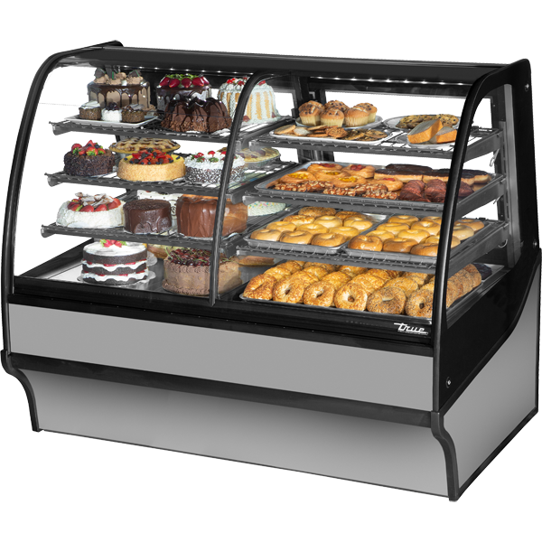True’s refrigerated display merchandisers combine efficient, high volume merchandising and exceptional refrigeration with an elegant curved glass front for sophisticated presentation of high end desserts and pastries. Refrigerated section features factory engineered, self-contained, capillary tube system using environmentally friendly R290 hydro carbon refrigerant that has zero (0) ozone depletion potential (ODP), & three (3) global warming potential (GWP). Refrigerated section features high capacity, factory balanced refrigeration system that has two (2) temperature range options. Standard temperature range maintains cabinet temperatures of 33°F to 41°F (.5°C to 5°C), ideally suited for refrigerated bakery and cold deli products. Optional temperature range maintains cabinet temperatures of 42°F to 65°F (5.5°C to 18.3°C), ideally suited for chocolate & wine options. Refrigerated section features exclusive reversing condenser fan motors. Fan motors reverse during defrost off cycles to help keep condenser coil free from dirt, dust and debris. Cabinet is NSF/ANSI Standard 7 certified to hold open food product. Two (2) rear sliding glass doors for back access. Exterior – stainless steel rounded front and back, stainless steel side and front panels. Curved glass front and side glass panels. Stainless steel interior for those who appreciate the value of stainless. Six (6) tiered levels of adjustable wire cantilever shelves that match cabinet interior color. Chrome plated wire shelves standard on stainless units. Front glass swings Up for easy cleaning access.