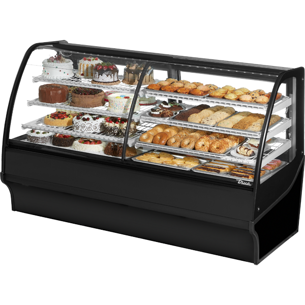 True’s refrigerated display merchandisers combine efficient, high volume merchandising and exceptional refrigeration with an elegant curved glass front for sophisticated presentation of high end desserts and pastries. Refrigerated section features factory engineered, self-contained, capillary tube system using environmentally friendly R290 hydro carbon refrigerant that has zero (0) ozone depletion potential (ODP), & three (3) global warming potential (GWP). Refrigerated section features high capacity, factory balanced refrigeration system. Standard temperature range maintains cabinet temperatures of 33°F to 41°F (.5°C to 5°C), ideally suited for refrigerated bakery and cold deli products. Cabinet is NSF/ANSI Standard 7 compliant to hold open food product. Two (2) rear sliding glass doors for back access. Exterior – powder coated FDA black rounded front and back, black aluminum aesthetic side and front panels. Color options available (upcharge may apply) – white or stainless. Curved glass front and side glass panels. Interior – powder coated FDA white over CRS material. Color options available (upcharge may apply) – black or stainless. Six (6) tiered levels of adjustable wire cantilever shelves that match cabinet interior color. Chrome plated wire shelves standard on stainless units. Front glass swings Up for easy cleaning access.