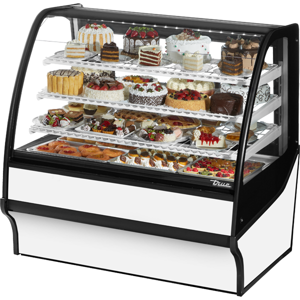 True’s refrigerated display merchandisers combine efficient, high volume merchandising and exceptional refrigeration with an elegant curved glass front for sophisticated presentation of high end desserts and pastries. Factory engineered, self-contained, capillary tube system using environmentally friendly R290 hydro carbon refrigerant that has zero (0) ozone depletion potential (ODP), & three (3) global warming potential (GWP). High capacity, factory balanced refrigeration system that has two (2) temperature range options. Standard temperature range maintains cabinet temperatures of 33°F to 41°F (.5°C to 5°C), ideally suited for refrigerated bakery and cold deli products. Optional temperature range maintains cabinet temperatures of 42°F to 65°F (5.5°C to 18.3°C), ideally suited for chocolate & wine options. Exclusive reversing condenser fan motors. Fan motors reverse during defrost off cycles to help keep condenser coil free from dirt, dust and debris. Cabinet is NSF/ANSI Standard 7 certified to hold open food product. Two (2) rear sliding glass doors for back access. Exterior – powder coated FDA white rounded front and back, white aluminum aesthetic side and front panels. Color options available (upcharge may apply) – black or stainless. Curved glass front and side glass panels. Interior – powder coated FDA white over CRS material. Color options available (upcharge applies) – black or stainless. Three (3) tiered levels of adjustable wire cantilever shelves that match cabinet interior color. Chrome plated wire shelves standard on stainless units. Front glass swings Up for easy cleaning access.