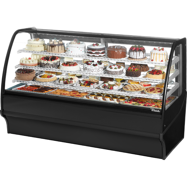 True’s refrigerated display merchandisers combine efficient, high volume merchandising and exceptional refrigeration with an elegant curved glass front for sophisticated presentation of high end desserts and pastries. Factory engineered, self-contained, capillary tube system using environmentally friendly R290 hydro carbon refrigerant that has zero (0) ozone depletion potential (ODP), & three (3) global warming potential (GWP). High capacity, factory balanced refrigeration system. Standard temperature range maintains cabinet temperatures of 33°F to 41°F (.5°C to 5°C), ideally suited for refrigerated bakery and cold deli products. Cabinet is NSF/ANSI Standard 7 compliant to hold open food product. Two (2) rear sliding glass doors for back access. Exterior – powder coated FDA black rounded front and back, black aluminum aesthetic side and front panels. Color options available (upcharge may apply) – white or stainless. Curved glass front and side glass panels. Interior – powder coated FDA white over CRS material. Color options available (upcharge may apply) – black or stainless. Three (3) tiered levels of adjustable wire cantilever shelves that match cabinet interior color. Chrome plated wire shelves standard on stainless units. Front glass swings Up for easy cleaning access.