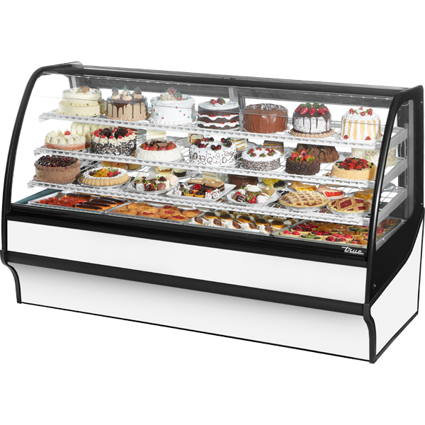 True’s refrigerated display merchandisers combine efficient, high volume merchandising and exceptional refrigeration with an elegant curved glass front for sophisticated presentation of high end desserts and pastries. Factory engineered, self-contained, capillary tube system using environmentally friendly R290 hydro carbon refrigerant that has zero (0) ozone depletion potential (ODP), & three (3) global warming potential (GWP). High capacity, factory balanced refrigeration system that has two (2) temperature range options. Standard temperature range maintains cabinet temperatures of 33°F to 41°F (.5°C to 5°C), ideally suited for refrigerated bakery and cold deli products. Optional temperature range maintains cabinet temperatures of 42°F to 65°F (5.5°C to 18.3°C), ideally suited for chocolate & wine options. Exclusive reversing condenser fan motors. Fan motors reverse during defrost off cycles to help keep condenser coil free from dirt, dust and debris. Cabinet is NSF/ANSI Standard 7 certified to hold open food product. Two (2) rear sliding glass doors for back access. Exterior – powder coated FDA white rounded front and back, white aluminum aesthetic side and front panels. Color options available (upcharge may apply) – black or stainless. Curved glass front and side glass panels. Interior – powder coated FDA white over CRS material. Color options available (upcharge applies) – black or stainless. Three (3) tiered levels of adjustable wire cantilever shelves that match cabinet interior color. Chrome plated wire shelves standard on stainless units. Front glass swings Up for easy cleaning access.