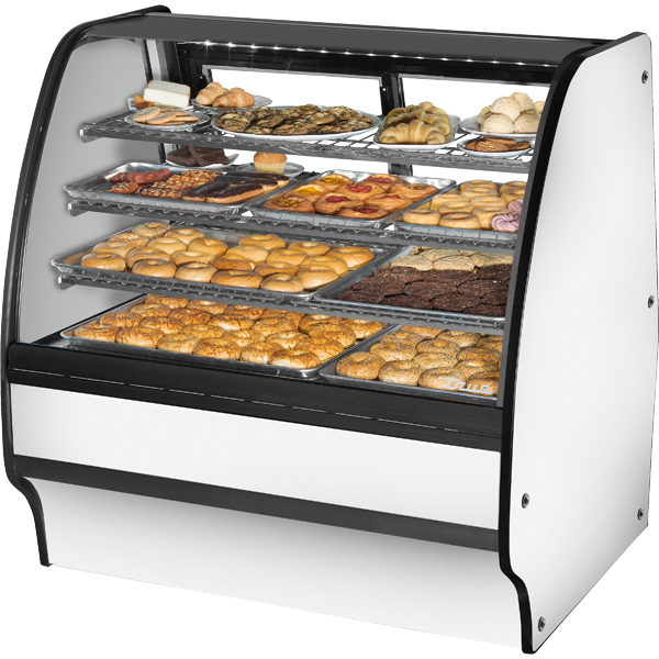 True’s refrigerated glass merchandisers combine efficient, high volume merchandising and exceptional refrigeration with an elegant curved glass front for sophisticated presentation of high end desserts and pastries. Cabinet is NSF/ANSI Standard 2 compliant to hold open food product. Two (2) rear sliding glass doors for back access. Exterior – powder coated FDA black rounded front and back, solid wood sides with aluminum cover and front panels. Color options available (upcharge may apply) – white or stainless. Interior – powder coated FDA white over CRS material. Color options available (upcharge may apply) – black or stainless. Three (3) tiered levels of adjustable wire cantilever shelves that match cabinet interior color. Chrome plated wire shelves standard on stainless units. Curved glass front is single pane tempered glass with extra large viewing area to maximize product presentation.