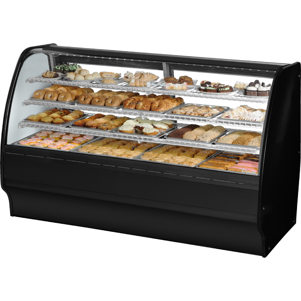 True’s “dry” glass merchandisers combines efficient, high volume merchandising with an elegant curved glass front for sophisticated presentation of high end desserts and pastries. Cabinet is NSF/ANSI Standard 2 compliant to hold open food product. Two (2) rear sliding glass doors for back access. Exterior – powder coated FDA black rounded front and back, solid wood sides with aluminum cover and front panels. Color options available (upcharge may apply) – white or stainless. Interior – powder coated FDA white over CRS material. Color options available (upcharge may apply) – black or stainless. Three (3) tiered levels of adjustable wire cantilever shelves that match cabinet interior color. Chrome plated wire shelves standard on stainless units. Curved glass front is single pane tempered glass with extra large viewing area to maximize product presentation.