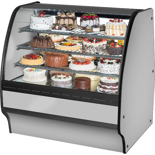 True’s refrigerated glass merchandisers combine efficient, high volume merchandising and exceptional refrigeration with an elegant curved glass front for sophisticated presentation of high end desserts and pastries. Factory engineered, self-contained, capillary tube system using environmentally friendly R290 hydro carbon refrigerant that has zero (0) ozone depletion potential (ODP), & three (3) global warming potential (GWP). High capacity, factory balanced refrigeration system. Standard temperature range maintains cabinet temperatures of 33°F to 41°F (.5°C to 5°C), ideally suited for refrigerated bakery and cold deli products. Cabinet is NSF/ANSI Standard 7 compliant to hold open food product. Two (2) rear sliding glass doors for back access. Exterior – powder coated FDA black rounded front and back, solid wood sides with aluminum cover and front panels. Color options available (upcharge may apply) – white or stainless. Interior – powder coated FDA white over CRS material. Color options available (upcharge may apply) – black or stainless. Three (3) tiered levels of adjustable wire cantilever shelves that match cabinet interior color. Chrome plated wire shelves standard on stainless units. Curved glass front is single pane tempered glass with extra large viewing area to maximize product presentation.