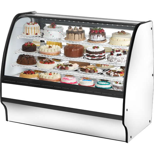 True’s refrigerated glass merchandisers combine efficient, high volume merchandising and exceptional refrigeration with an elegant curved glass front for sophisticated presentation of high end desserts and pastries. Factory engineered, self-contained, capillary tube system using environmentally friendly R290 hydro carbon refrigerant that has zero (0) ozone depletion potential (ODP), & three (3) global warming potential (GWP). High capacity, factory balanced refrigeration system. Standard temperature range maintains cabinet temperatures of 33°F to 41°F (.5°C to 5°C), ideally suited for refrigerated bakery and cold deli products. Cabinet is NSF/ANSI Standard 7 compliant to hold open food product. Two (2) rear sliding glass doors for back access. Exterior – powder coated FDA black rounded front and back, solid wood sides with aluminum cover and front panels. Color options available (upcharge may apply) – white or stainless. Interior – powder coated FDA white over CRS material. Color options available (upcharge may apply) – black or stainless. Three (3) tiered levels of adjustable wire cantilever shelves that match cabinet interior color. Chrome plated wire shelves standard on stainless units. Curved glass front is single pane tempered glass with extra large viewing area to maximize product presentation.