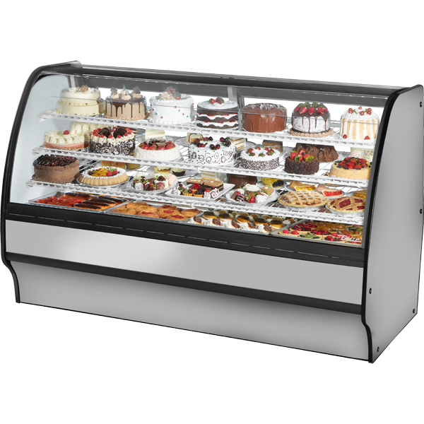 True’s refrigerated glass merchandisers combine efficient, high volume merchandising and exceptional refrigeration with an elegant curved glass front for sophisticated presentation of high end desserts and pastries. Factory engineered, self-contained, capillary tube system using environmentally friendly R290 hydro carbon refrigerant that has zero (0) ozone depletion potential (ODP), & three (3) global warming potential (GWP). High capacity, factory balanced refrigeration system. Standard temperature range maintains cabinet temperatures of 33°F to 41°F (.5°C to 5°C), ideally suited for refrigerated bakery and cold deli products. Cabinet is NSF/ANSI Standard 7 compliant to hold open food product. Two (2) rear sliding glass doors for back access. Exterior – powder coated FDA black rounded front and back, solid wood sides with aluminum cover and front panels. Color options available (upcharge may apply) – white or stainless. Interior – powder coated FDA white over CRS material. Color options available (upcharge may apply) – black or stainless. Three (3) tiered levels of adjustable wire cantilever shelves that match cabinet interior color. Chrome plated wire shelves standard on stainless units. Curved glass front is single pane tempered glass with extra large viewing area to maximize product presentation.
