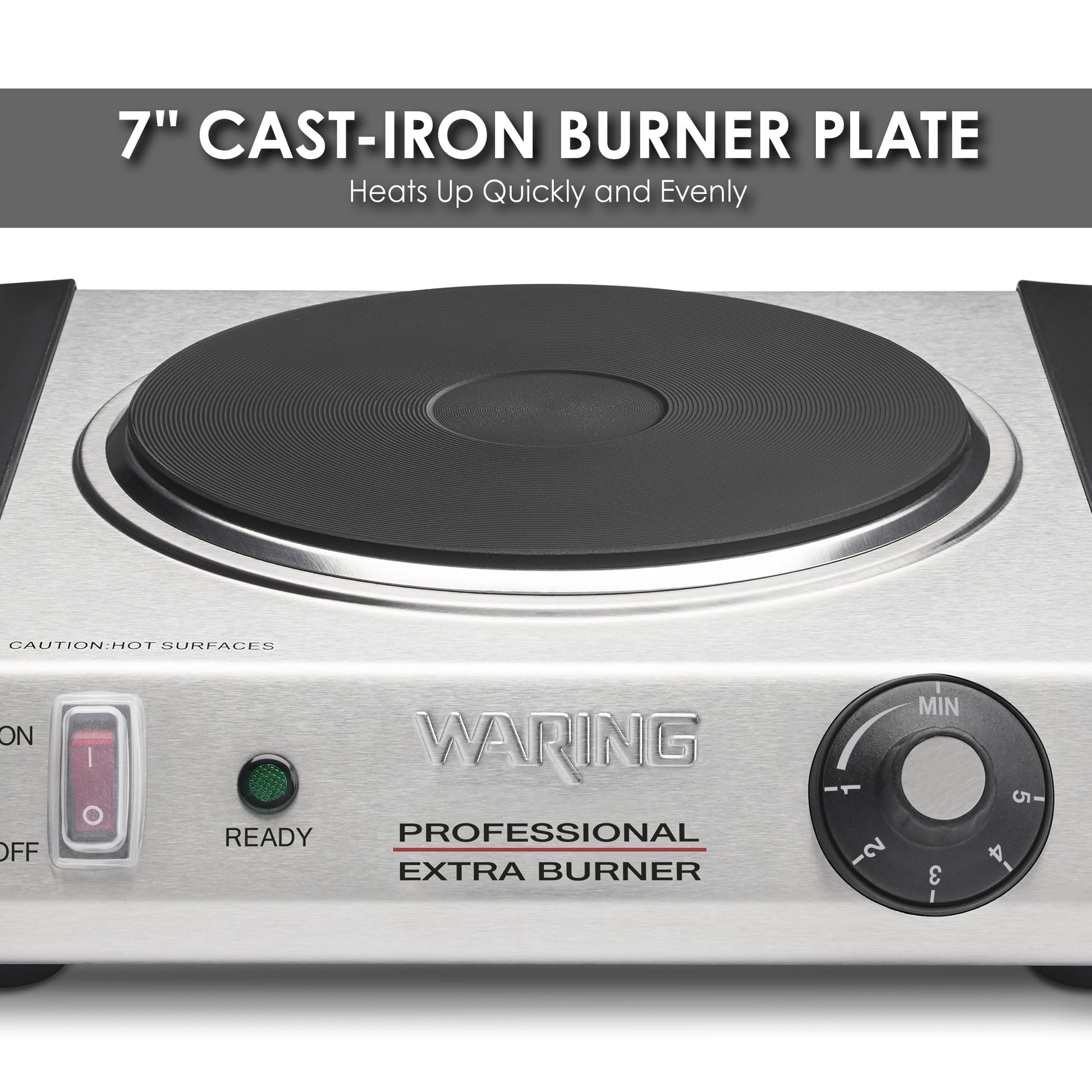 The Waring® WEB300 Commercial Cast-Iron Single Burner offers a heavy-duty, portable solution for your omelette, catering or buffet stations. A 1300 watt heating element heats up the 7" cast-iron burner plate quickly and evenly. Non-slip rubber feet keep the burner stable, while the adjustable thermostat with ON and READY indicator lights alert you when it reaches the desired temperature.